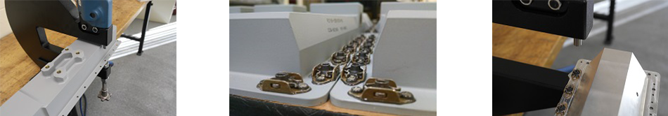 We are equipped with two US Air Tool rivet guns one bench-top and one hand-held allowing us to handle a variety of riveting tasks. Our hand held model has a throat depth of 1-1/2" and the Bench-top model has a reach of 10" and a gap of 3-1/2".